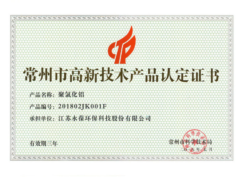 近日,我公司凈水材料聚氯化鋁產(chǎn)品獲得常州市科技局高新技術(shù)產(chǎn)品認(rèn)定。