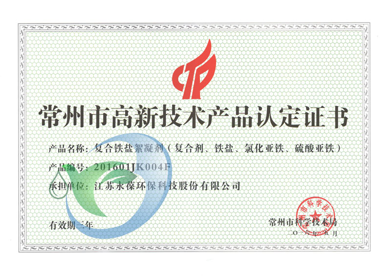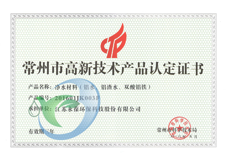 近日,我公司凈水材料(鋁水、鋁渣水、雙酸鋁鐵)、復(fù)合鐵鹽絮凝劑(復(fù)合劑、鐵鹽、氯化亞鐵、硫酸亞鐵)及凈水材料(聚氯化鋁鐵、立凈靈)三項(xiàng)產(chǎn)品獲得常州市科技局高新技術(shù)產(chǎn)品認(rèn)定。