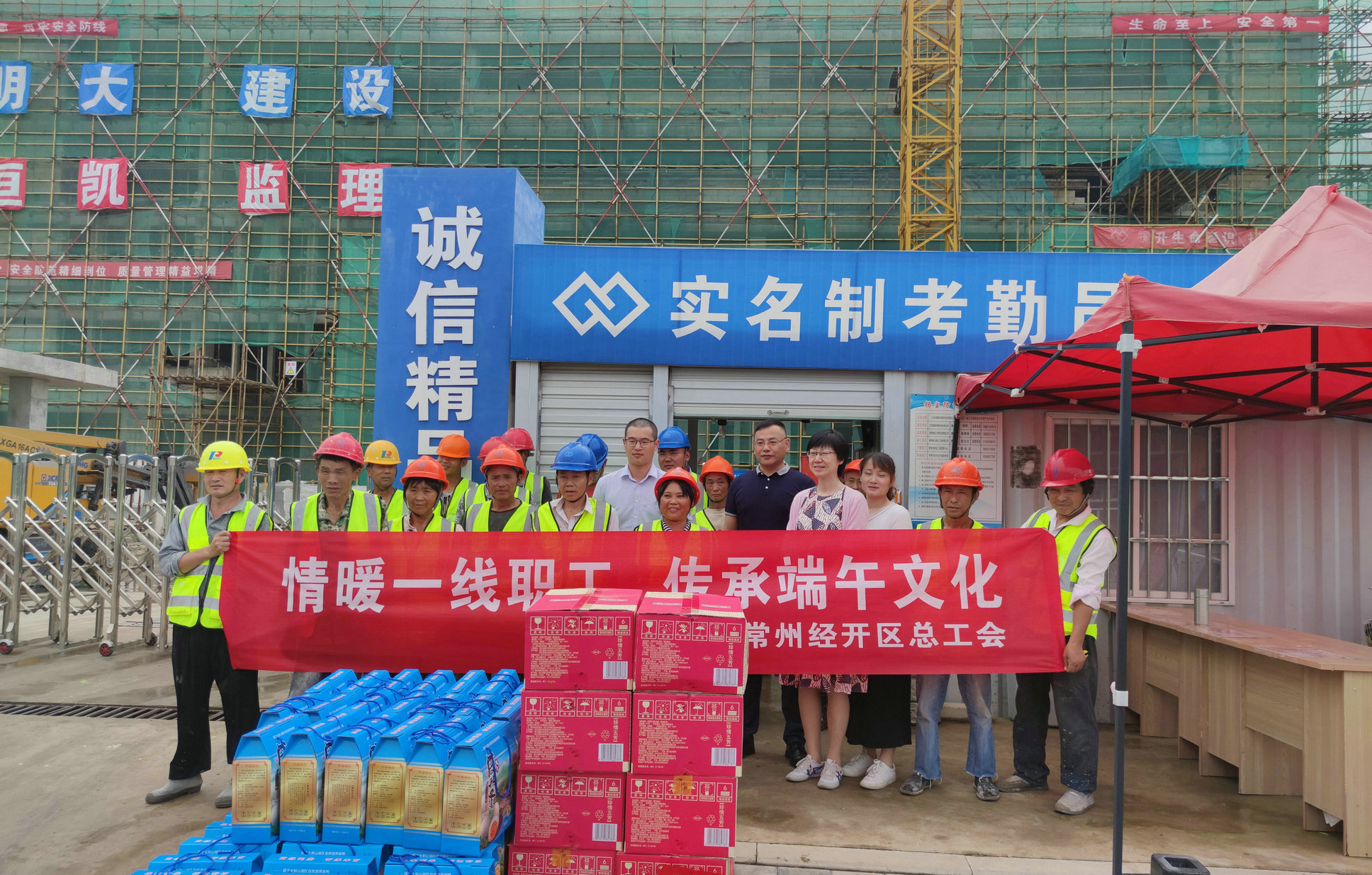 6月24日下午,端午節(jié)來(lái)臨之際,常州市經(jīng)開(kāi)區(qū)工會(huì)金主席一行專(zhuān)程前往綠聯(lián)項(xiàng)目工地開(kāi)展“情暖一線職工,傳承端午文化”節(jié)日慰問(wèn)活動(dòng),親自為一線工人發(fā)放端午禮品,祝他們節(jié)日快樂(lè),身體安康,并把經(jīng)開(kāi)區(qū)領(lǐng)導(dǎo)對(duì)綠聯(lián)項(xiàng)目的關(guān)心傳達(dá)到工地的每一位建設(shè)者。永葆環(huán)保工會(huì)主席段昌海,項(xiàng)目經(jīng)理張珂參與此次活動(dòng),向領(lǐng)導(dǎo)匯報(bào)綠聯(lián)項(xiàng)目的建設(shè)進(jìn)展情況。