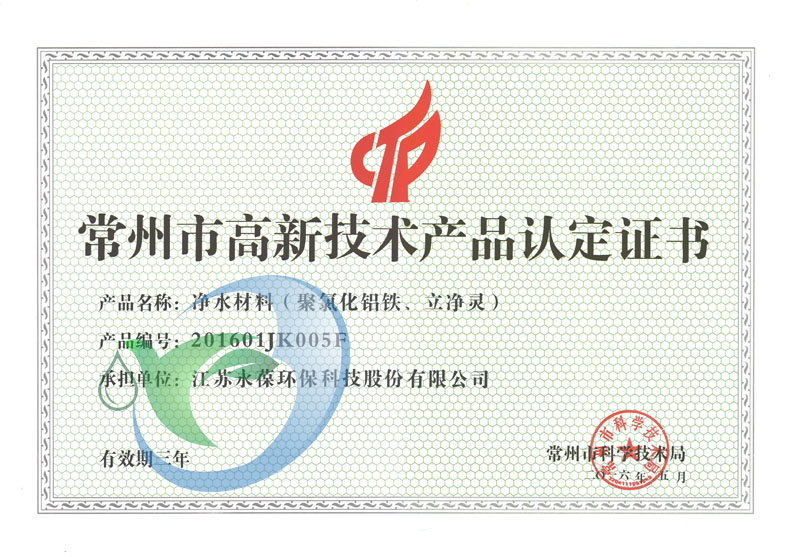 近日,我公司凈水材料(鋁水、鋁渣水、雙酸鋁鐵)、復(fù)合鐵鹽絮凝劑(復(fù)合劑、鐵鹽、氯化亞鐵、硫酸亞鐵)及凈水材料(聚氯化鋁鐵、立凈靈)三項(xiàng)產(chǎn)品獲得常州市科技局高新技術(shù)產(chǎn)品認(rèn)定。